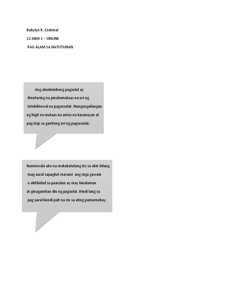 Gawain batay sa natutunan sa. Akademikong Sulatin Ang akademikong sulatin ay isang uri ng pagsulat na kung saan ito ay naglalaman ng mga mahahalagang impormasyon ito ay ginagamit upang maibahagi nila ang kanilang mga nalalaman sa ibang tao. Filipino sa piling larang Akademikong Pagsulat.